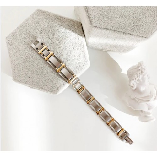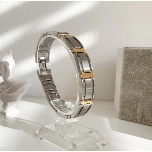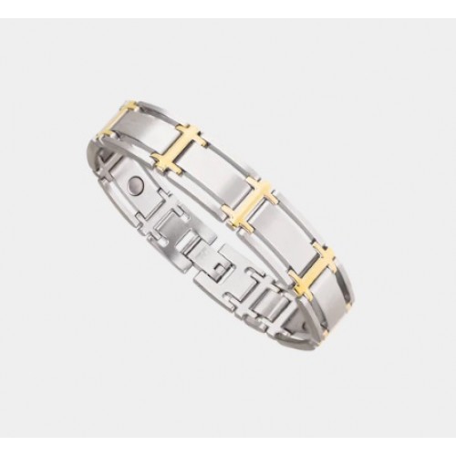This bracelet is a smart combination of matte stainless steel and 18K gold plated accents, designed to look great in the boardroom or with your best casual wear. There is a 1200 gauss Samarium Cobalt magnet in each large link! Sabona chooses Samarium Cobalt magnets for long term durability and rust resistant qualities.