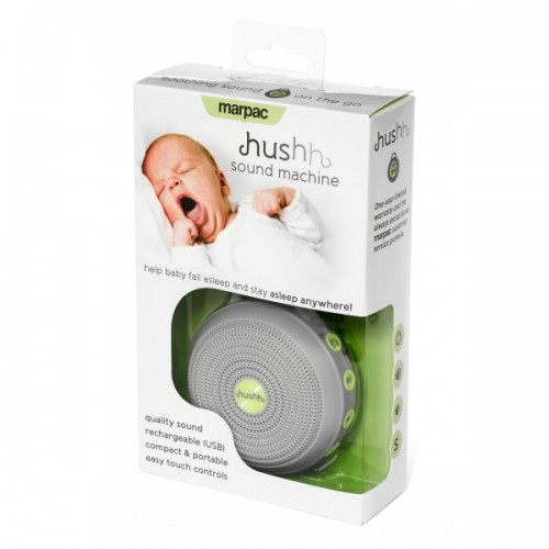 From Marpac, makers of the beloved Dohm-DS All-Natural White Noise Sound Machine, comes Hushh, a portable electronic sound machine designed to help baby fall asleep and stay asleep anywhere. The Hushh cradles your baby in soothing sound to create a comforting, consistent sound environment for sleep. This compact portable unit comes with 3 sound options: choose from bright white noise, deep white noise, or gentle surf and a wide volume range. Hushh is powered by a lithium ion battery and recharges from a micro-usb cord (included). Throughout nighttime or naptime, it masks disruptive noises to promote longer, more restful sleep cycles.