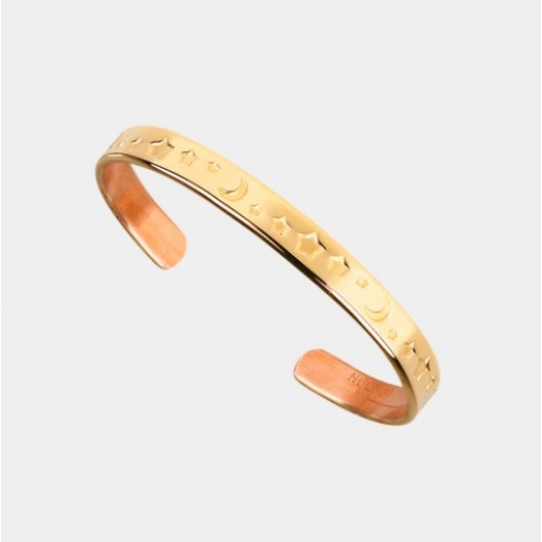 The copper bracelet is plated in 24-carat gold on the outside, leaving the copper on the inside against the skin.