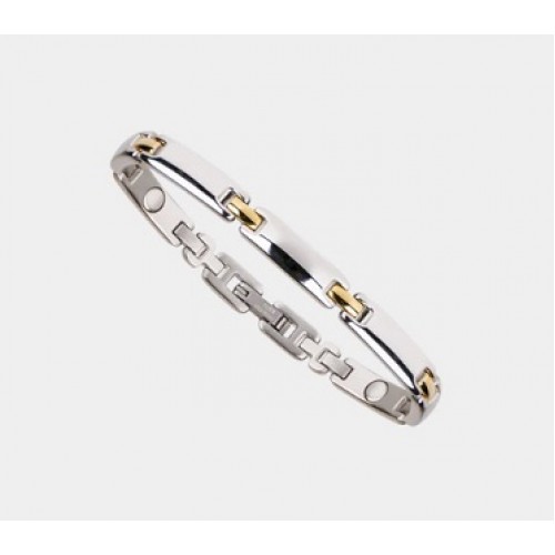 The Lady Executive Silver Duet Magnetic features one 1200 gauss samarium cobalt magnet is in each polished stainless steel link. The small connector links plated in 18K gold adds just enough contrast to make this bracelet perfect for dress or casual wear. Sabona chooses Samarium Cobalt magnets for long term durability and rust resistant qualities. Sabona also incorporates the best quality clasp in magnetic bracelets! The clasp is designed to fasten securely to prevent inadvertent opening and the loss of the bracelet. Sabona Magnetic Bracelets are linked together using permanent pins. The bracelets are designed to stay intact therefore removal of links is not recommended.