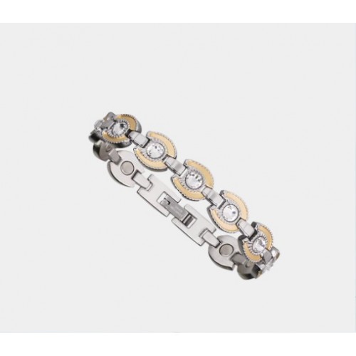 Two tone gold plating and polished stainless designs always make a great combination! Bright and clear cubic zirconia gems set in attractive horseshoe links with 18K gold plated accents make this bracelet a beautiful addition to your jewelry collection. A 1200 gauss Samarium Cobalt magnet is each link. Sabona chooses Samarium Cobalt magnets for long term durability and rust resistant qualities.