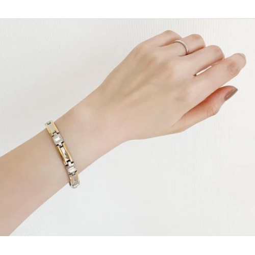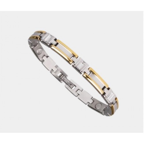 This bracelet features an emerald-cut CZ gem, polished stainless steel, and 18k gold plating. This is a great design with the benefit of a 1200 gauss magnet in each link.