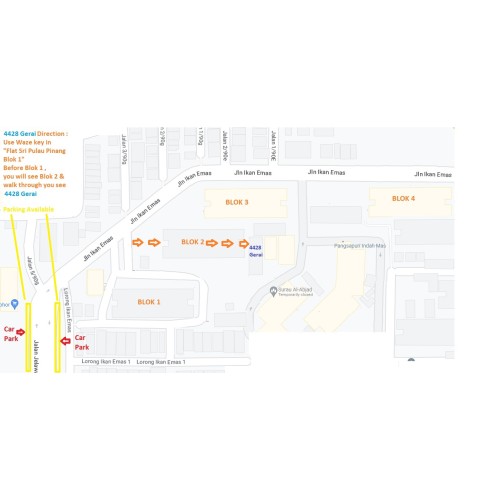 Use Waze key in "Flat Sri Pulau Pinang Blok 1" , you will see Blok 2 anad walk through you see 4428 Gerai.