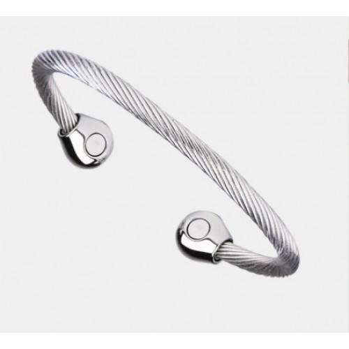 This bracelet is a comfortable alternative style for magnetic bracelets. The stainless steel twisted wire is accented by the polished stainless steel end pieces. Each end piece contains a 1200 gauss Samarium Cobalt magnet!